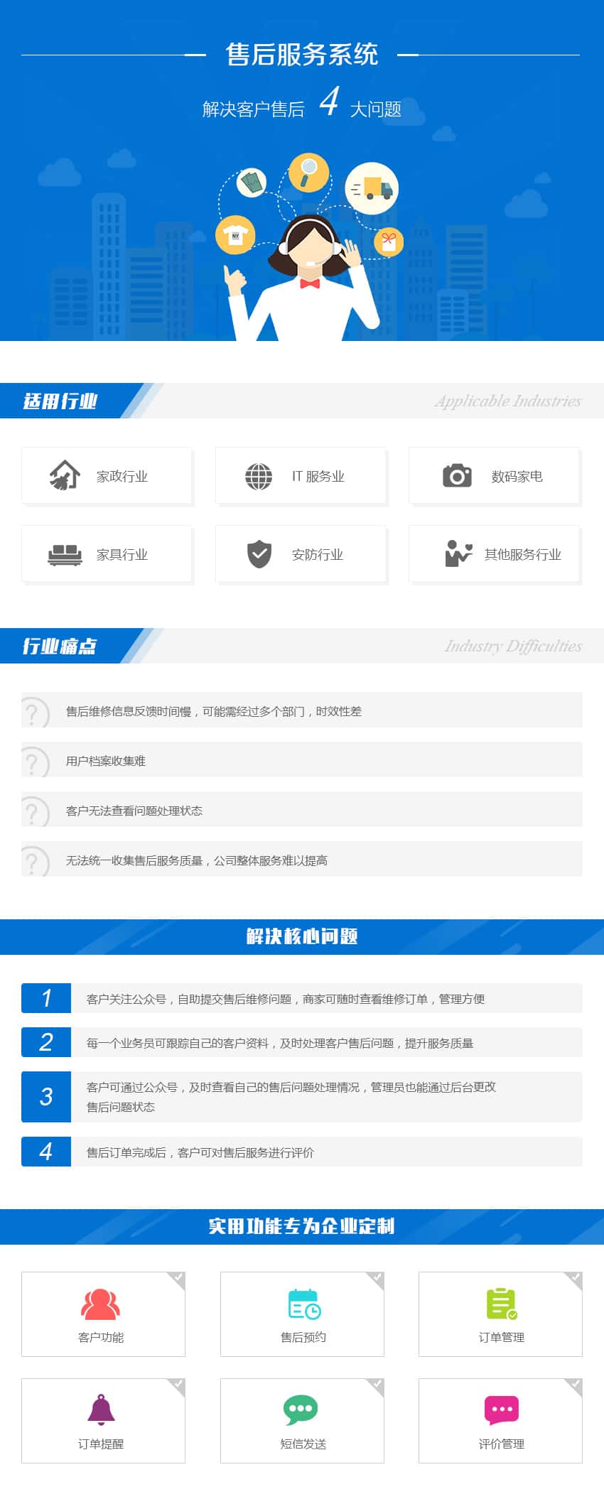 1、客户关注公众号,自助提交售后维修问题,商家可随时查看维修订单,管理方便。